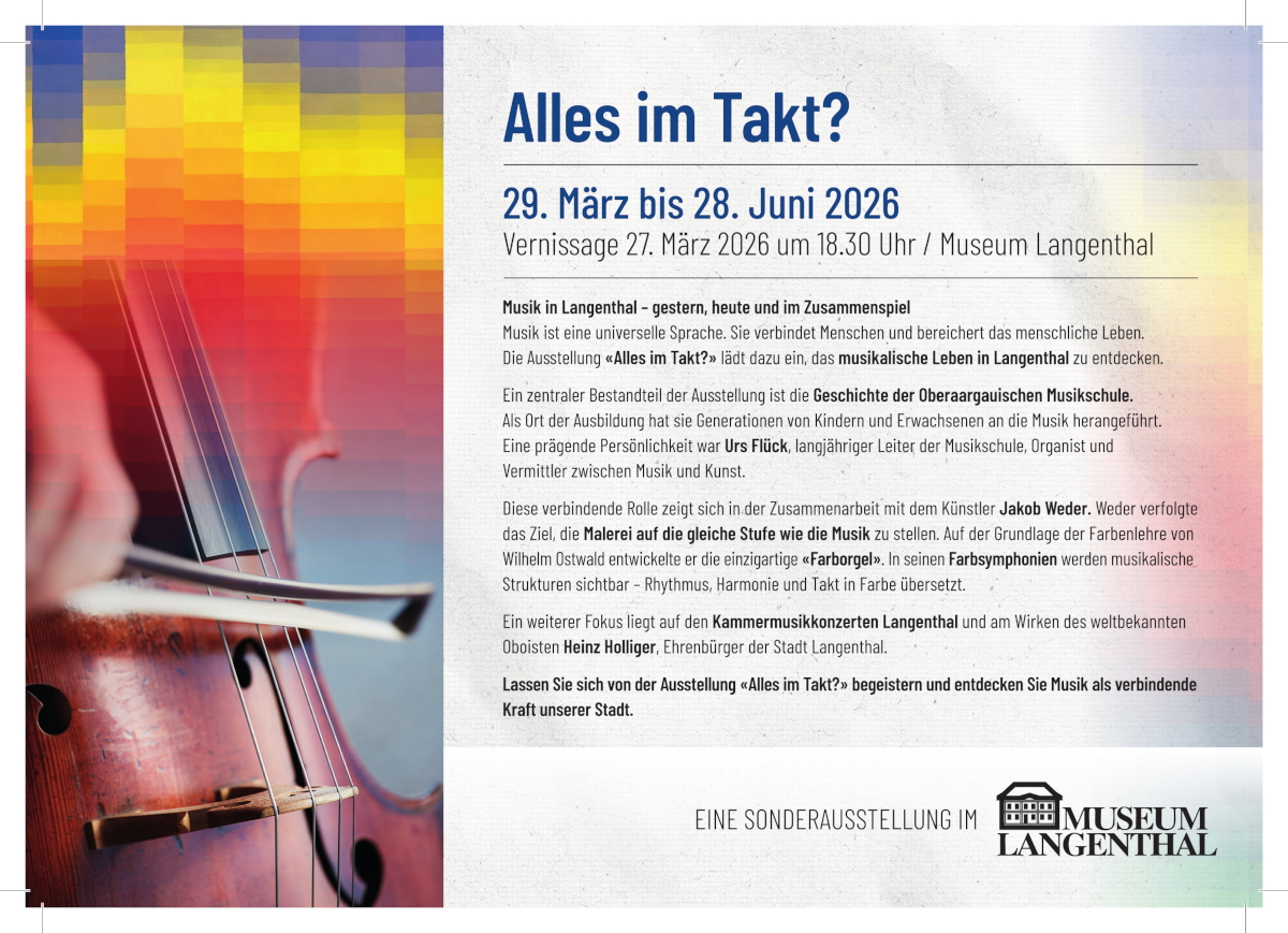Musik ist eine universelle Sprache. Sie verbindet Menschen und bereichert das menschliche Leben. Die Ausstellung «Alles im Takt?» lädt dazu ein, das musikalische Leben in Langenthal zu entdecken.