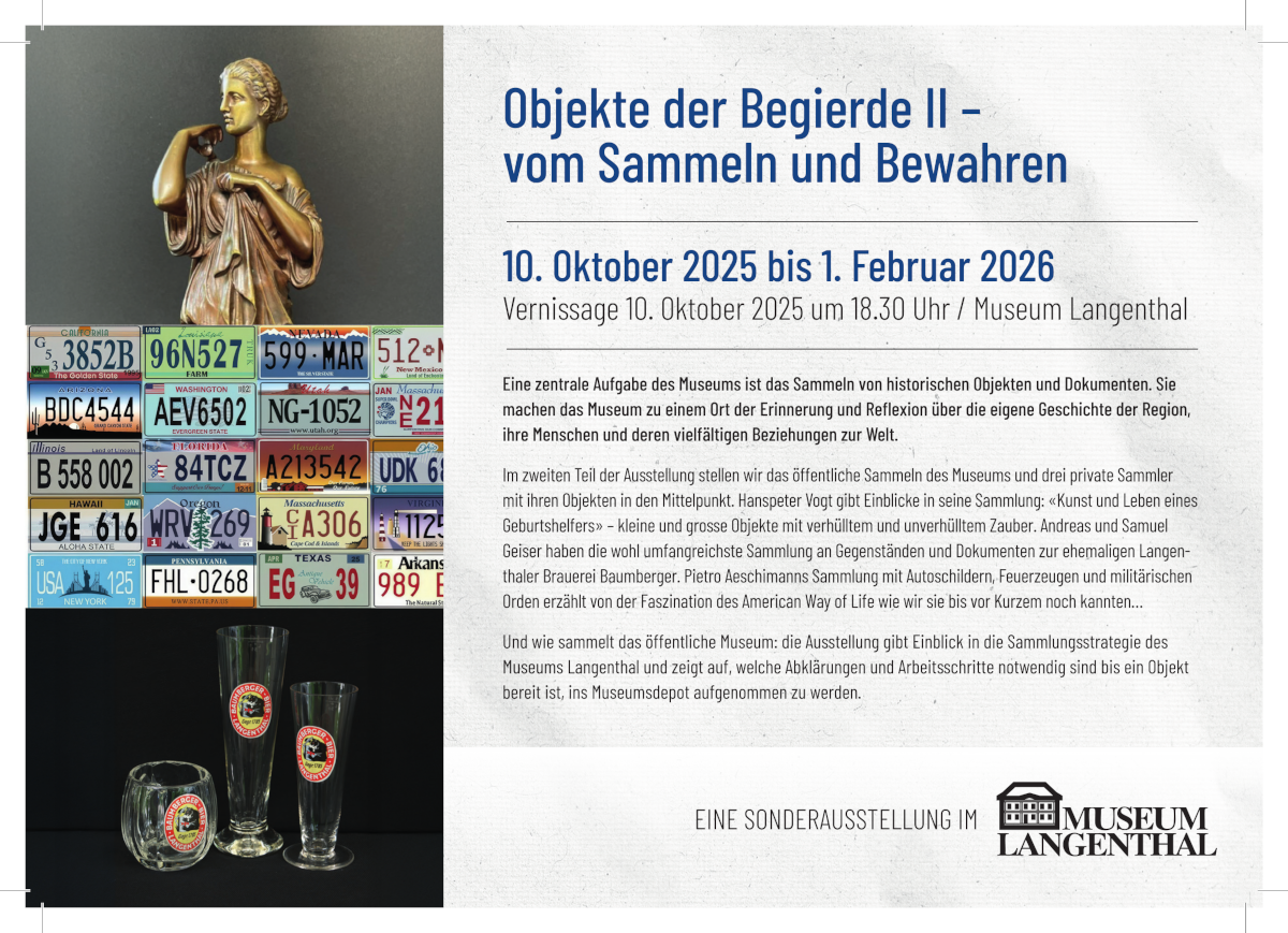 Im zweiten Teil der Ausstellung stellen wir das öffentliche Sammeln des Museums und drei private Sammler mit ihren Objekten in den Mittelpunkt. Hanspeter Vogt gibt Einblicke in seine Sammlung: «Kunst und Leben eines Geburtshelfers» – kleine und grosse Objekte mit verhülltem und unverhülltem Zauber. Andreas und Samuel Geiser haben die wohl umfangreichste Sammlung an Gegenständen und Dokumenten zur ehemaligen Langen- thaler Brauerei Baumberger. Pietro Aeschimanns Sammlung mit Autoschildern, Feuerzeugen und militärischen Orden erzählt von der Faszination des American Way of Life wie wir sie bis vor Kurzem noch kannten…