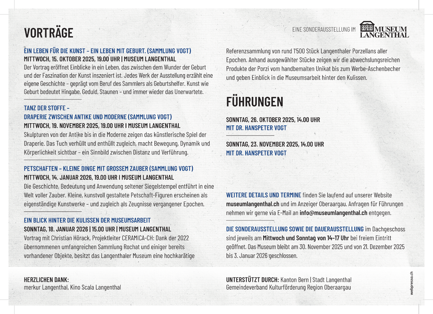 Vortrag mit Christian Hörack, Projektleiter CERAMICA-CH: Dank der 2022 übernommenen umfangreichen Sammlung Rochat und einiger bereits vorhandener Objekte, besitzt das Langenthaler Museum eine hochkarätige Referenzsammlung von rund 1‘500 Stück Langenthaler Porzellans aller Epochen. Anhand ausgewählter Stücke zeigen wir die abwechslungsreichen Produkte der Porzi vom handbemalten Unikat bis zum Werbe-Aschenbecher und geben Einblick in die Museumsarbeit hinter den Kulissen.